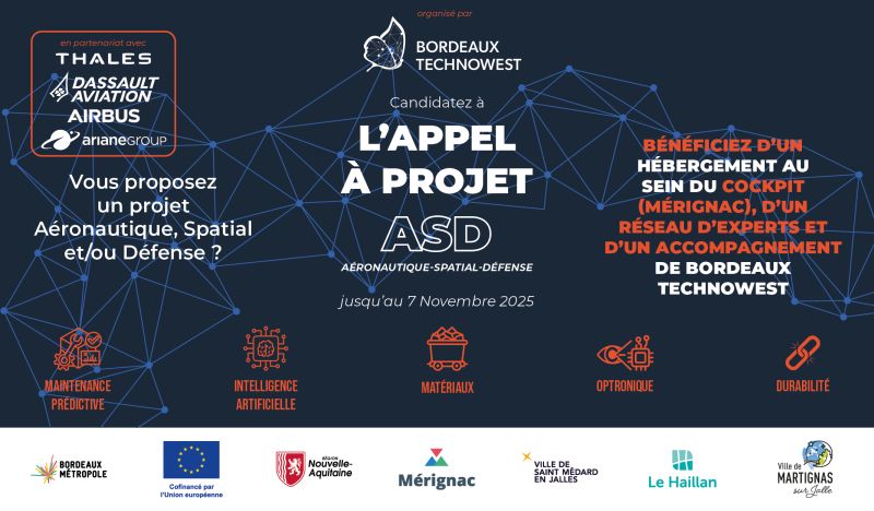 Bordeaux Technowest, en partenariat avec Dassault Aviation, Thales, ArianeGroup et Airbus, lance l’Appel à Projets ASD 2025.