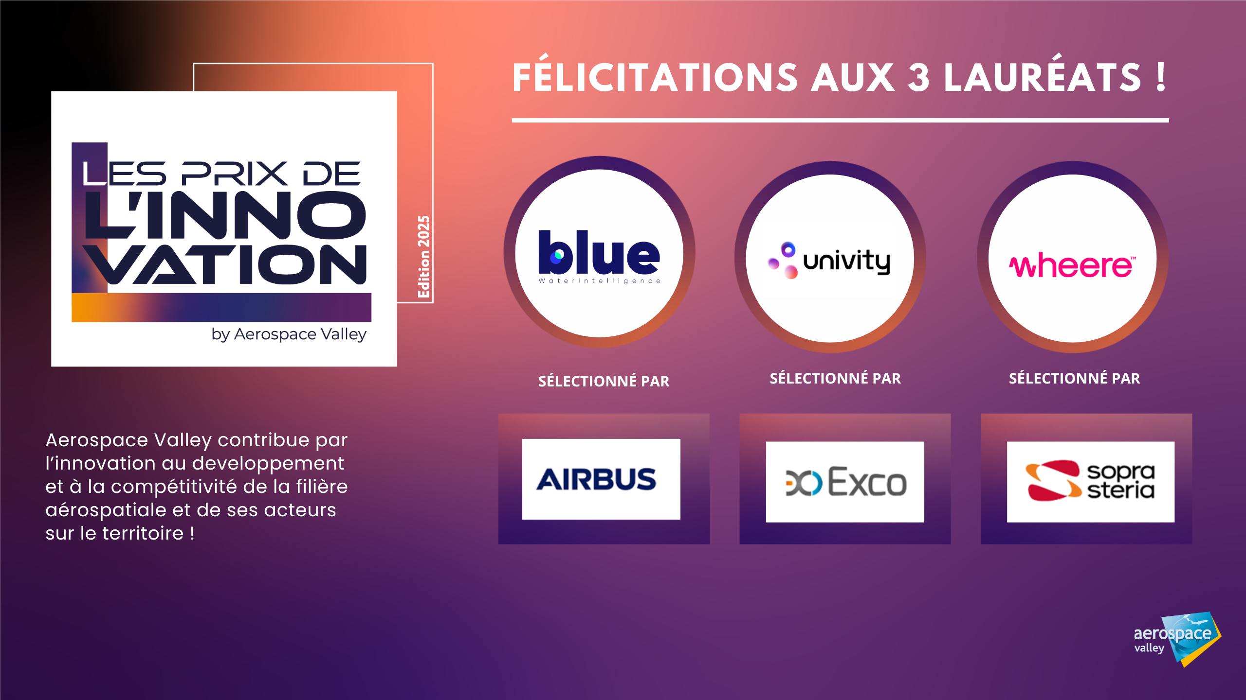 Un grand merci aux 3 sponsors des Prix de l’Innovation 2025 : Airbus Développement, Exco et Sopra Steria. Ces finalistes illustrent la dynamique d’innovation de l’écosystème Aerospace Valley !