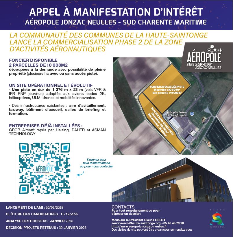 aéronautiques économiques, technologiques ou de formation sur l’AéroPôle Antoine de Saint-Exupéry, situé sur l’aérodrome de Jonzac-Neulles (Charente-Maritime) à 40 nautiques de Bordeaux Mérignac et 10 nautiques de Cognac.