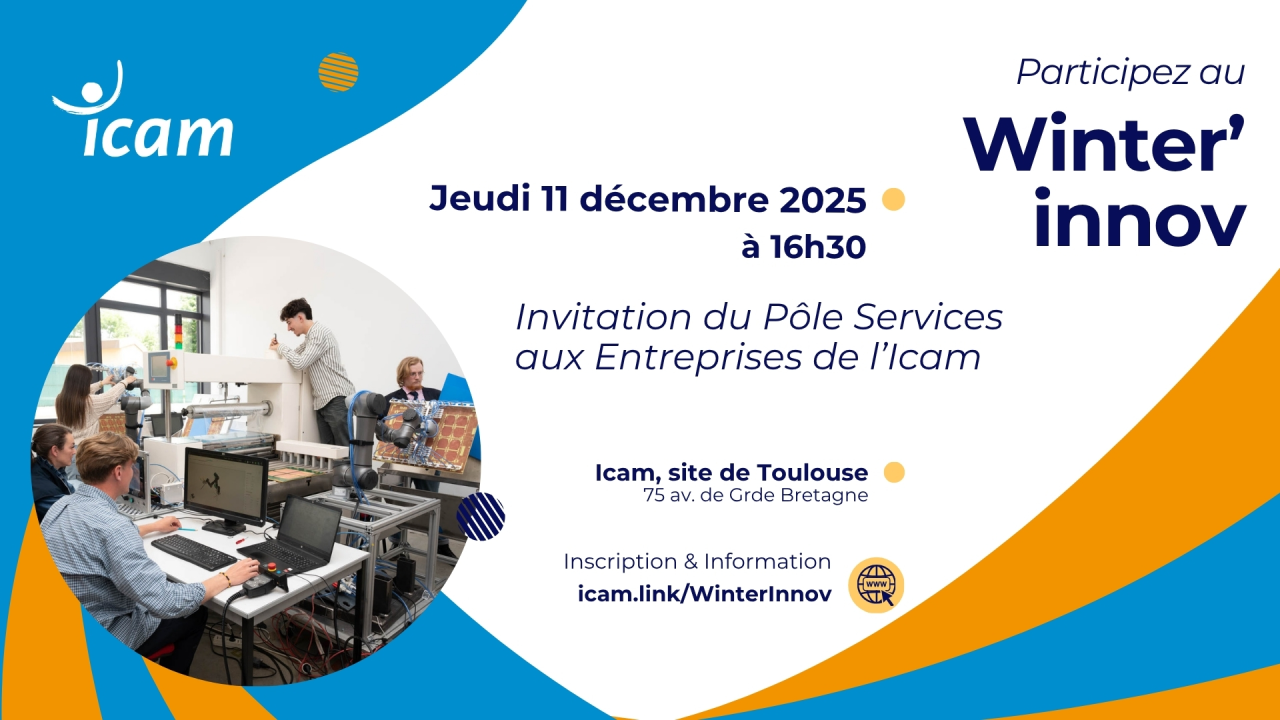 L’ICAM le plaisir de vous inviter à réserver la date du jeudi 11 décembre 2025 dans vos agendas pour participer à l’événement Winter'Innov de l’Icam Toulouse.