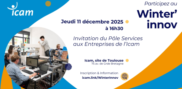 L’ICAM le plaisir de vous inviter à réserver la date du jeudi 11 décembre 2025 dans vos agendas pour participer à l’événement Winter'Innov de l’Icam Toulouse.