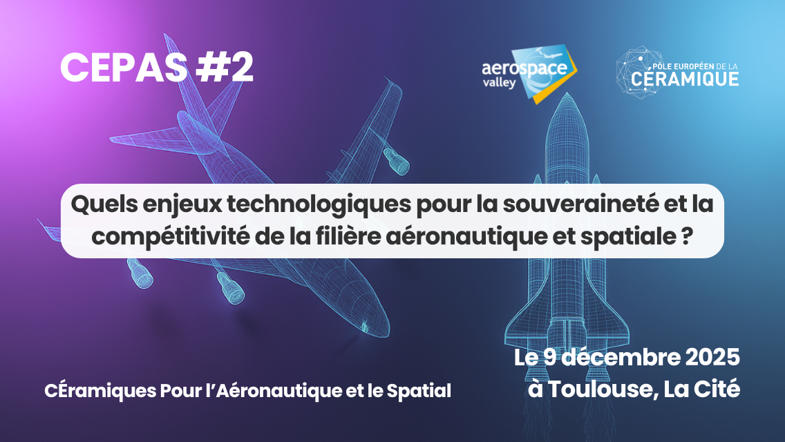 Les pôles de compétitivité Aerospace Valley et Pôle Européen de la Céramique ont le plaisir de vous convier à la 2ème édition du CÉPAS - CÉramiques Pour l’Aéronautique et le Spatial - le 9 décembre 2025 à Toulouse, à La Cité sur le thème : "Quels enjeux technologiques pour la souveraineté et la compétitivité de la filière aéronautique/spatiale ?"