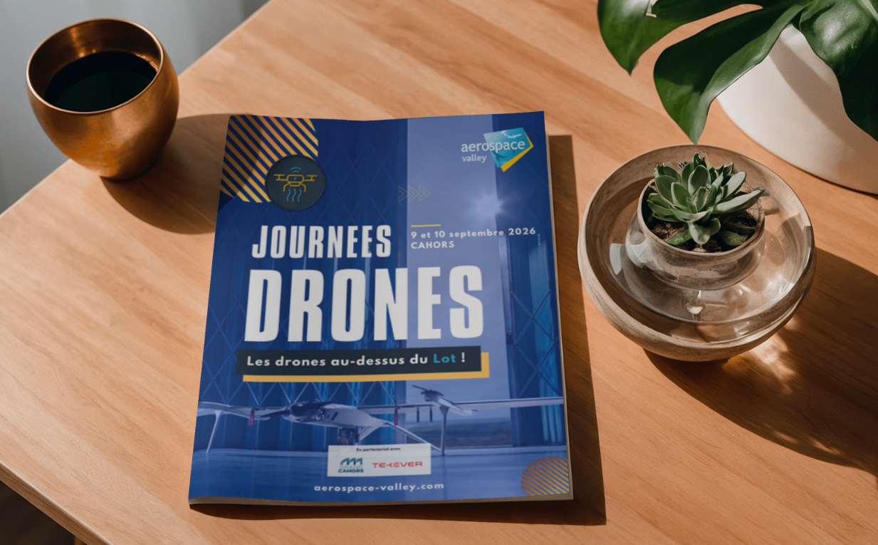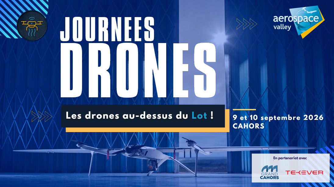 Nous vous donnons rendez-vous les mercredi 9 & jeudi 10 septembre 2026 à Cahors pour la 5ème édition des Journées Drones by Aerospace Valley autour du thème :