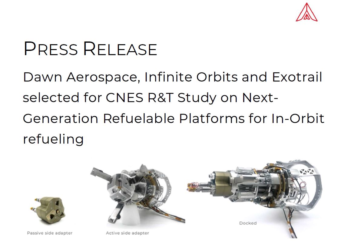 Dawn Aerospace, Infinite Orbits and Exotrail selected for CNES R&T Study on Next- Generation Refuelable Platforms for In-Orbit refueling